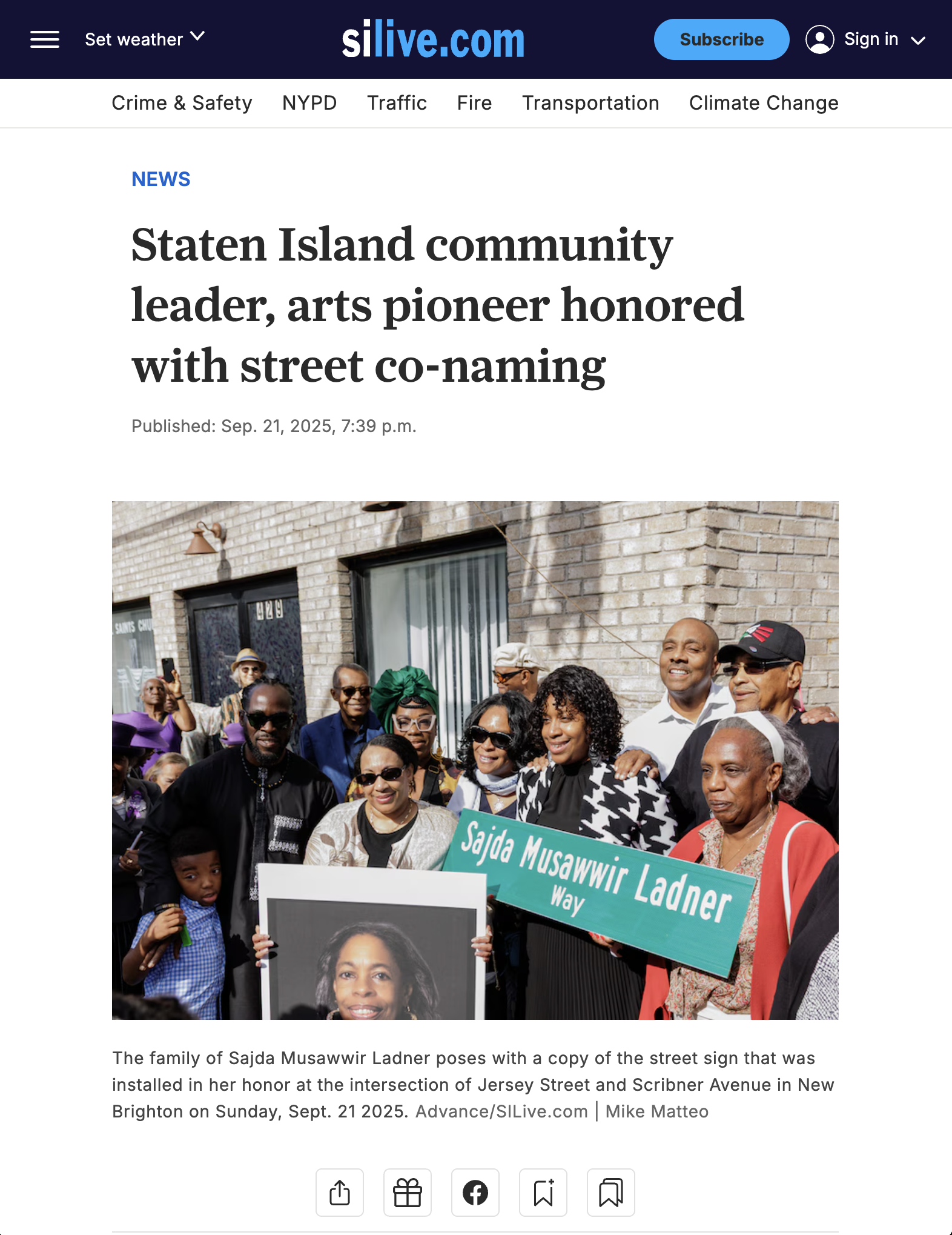 On Sunday, the corner of Jersey Street and Scribner Avenue in New Brighton was co-named in honor of Sajda Musawwir Ladner, the longtime executive director of the pioneering non-profit Universal Temple of the Arts, who died in 2021.