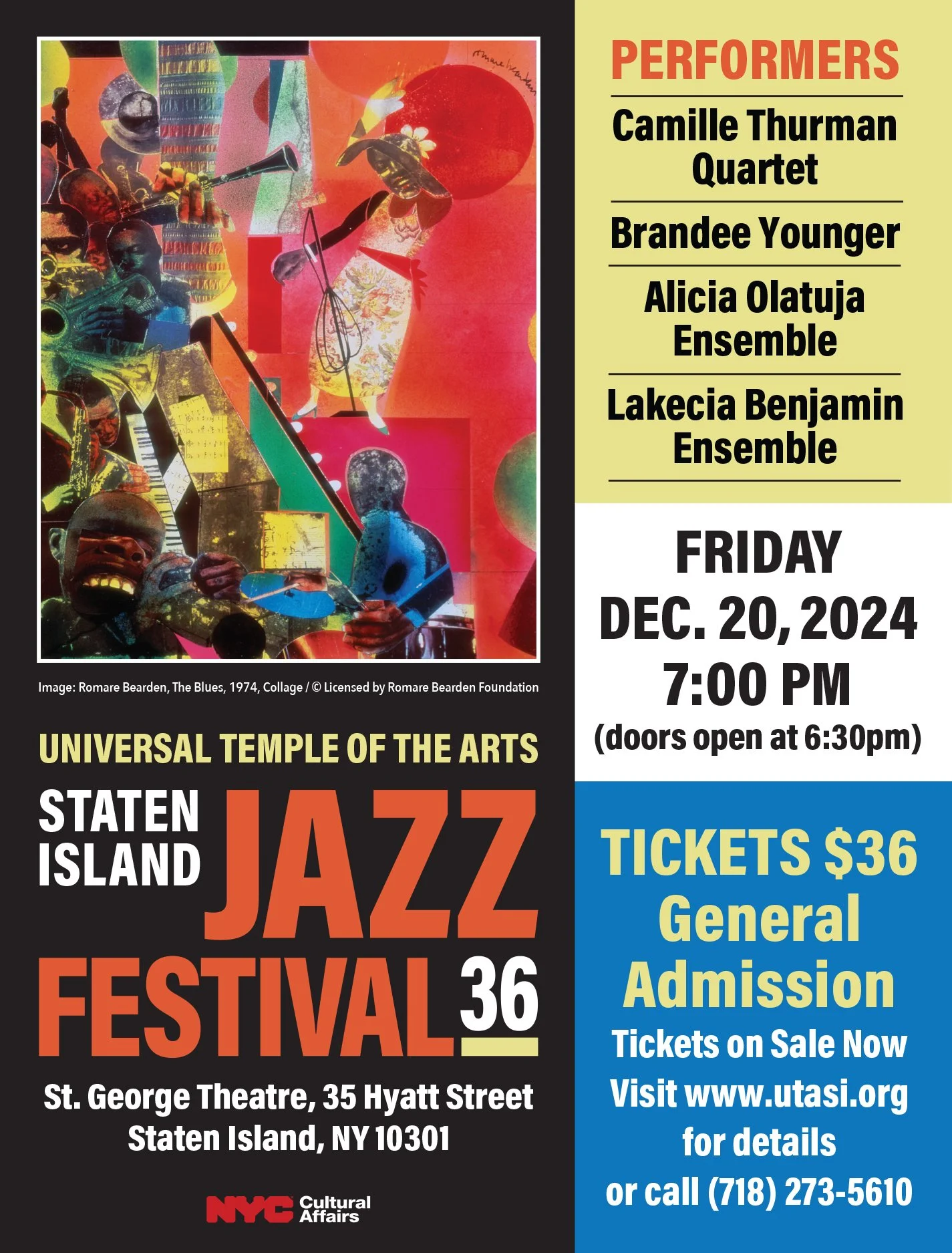 Since 2015, Universal Temple of the Arts has promoted the Staten Island JAZZ Festival with images by Romare Bearden, America’s preeminent African American visual artist, signifying the special relationship between Universal Temple of the Arts with iconic cultural creators and innovators since its inception in 1967 as an art, cultural and educational nonprofit organization.
