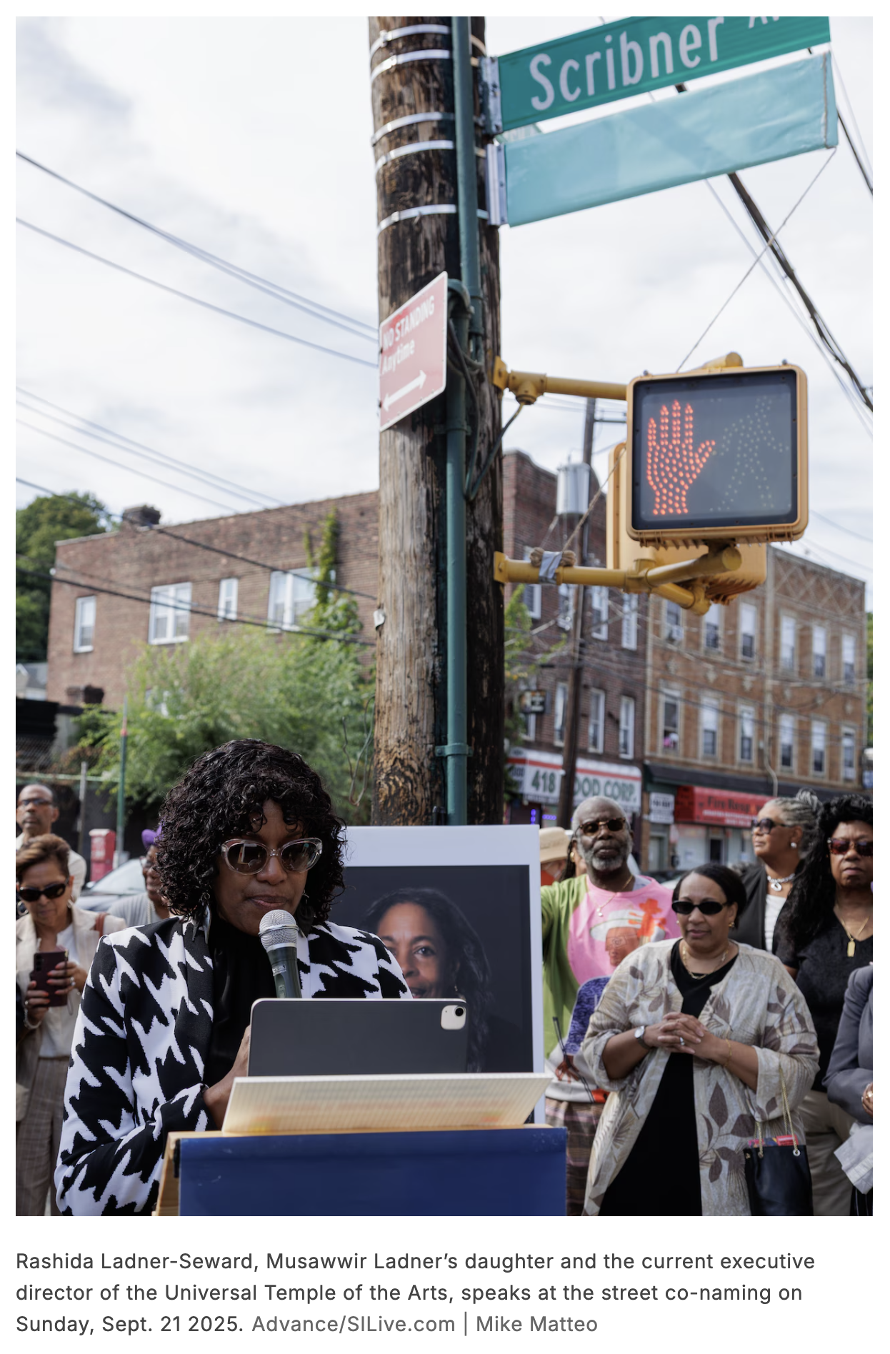 On Sunday, the corner of Jersey Street and Scribner Avenue in New Brighton was co-named in honor of Sajda Musawwir Ladner, the longtime executive director of the pioneering non-profit Universal Temple of the Arts, who died in 2021.